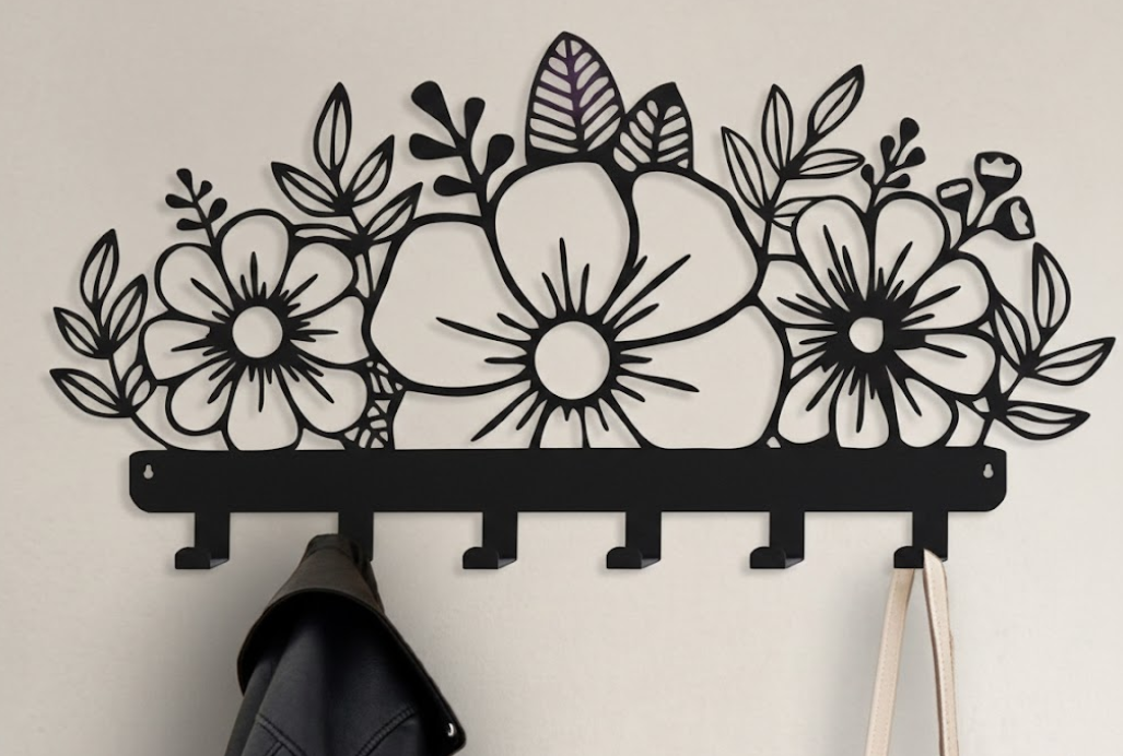 מדף מתכת בעיצוב ייחודי עם ווים לתלייה.