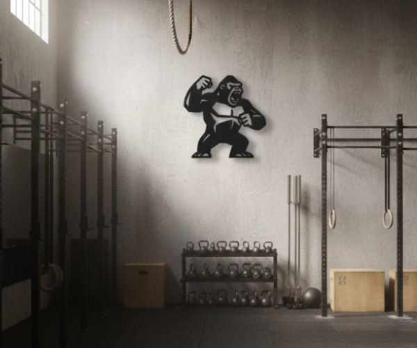 שלט ברזל בעיצוב גורילה דומיננטי הופך כל קיר סטנדרטי למוקד השראה שאי אפשר להתעלם ממנו.